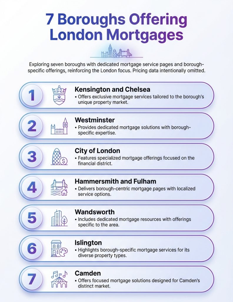 Seven London boroughs offering mortgages are highlighted. This infographic helps buyers compare options and terms across the capital.